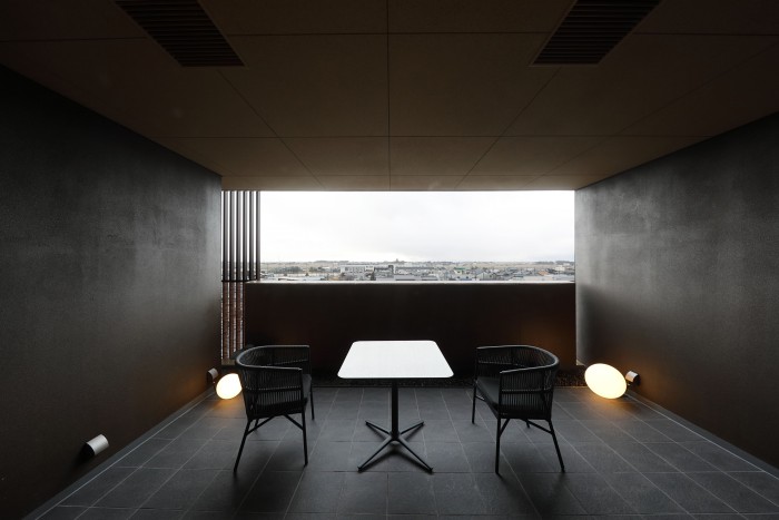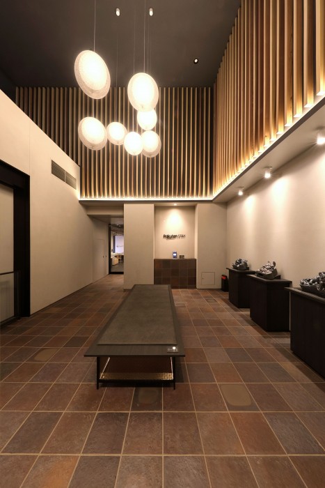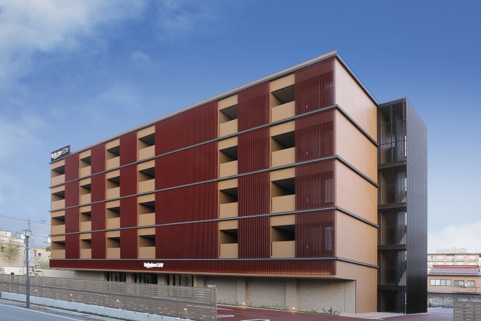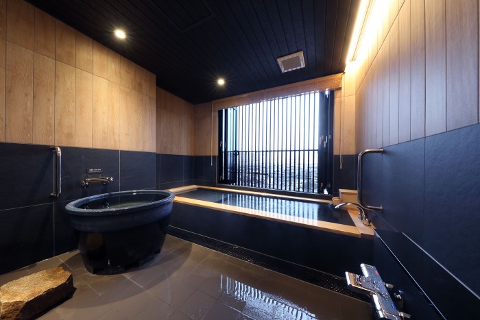 福井県のあわら温泉は明治時代に開湯し、関西の奥座敷として栄えた温泉街である。100年以上続く温泉街に、温泉を満喫できる“ネオ温泉宿”を求められた。 私たちは敷地内にある3つの源泉を活かし、全ての客室に温泉かけ流し風呂をつくる宿を計画した。 客室内の浴室は、最も大きな浴槽で3m×1mあり、家族皆で一緒に温泉を楽しめるサイズとした。この浴室の窓をフルオープンにすることで、町中にありながら24時間いつでも半露天のような開放感のある浴室として、非日常的な体験ができる空間とした。 外装デザインは、外壁は茶系を基調としつつ、えび茶色のルーバーでアクセントを付け、周囲の街並みとの調和と温泉街に自然に溶け込むことを意識した。